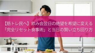 食事 【筋トレ民へ】飲み会翌日の絶望を希望に変える「完全リセット食事術」と当日の賢い立ち回り方 この記事では、飲み会による**筋トレへの悪影響を最小限に抑える「当日の賢い立ち回り術」から、万が一飲みすぎ・食べすぎても全てをリセットする「翌日の完璧なリカバリー食事術」まで、具体的かつ実践的な方法を徹底解説します。もう飲み会に怯える必要はありません。正しいリセット術を学び、トレーニングと社会生活を賢く両立させましょう。 2025.10.19 食事