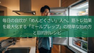 食事 毎日の自炊が「めんどくさい」人へ。筋トレ効果を最大化する「ミールプレップ」の簡単な始め方と目的別レシピ この記事では、毎日の自炊のめんどくささからあなたを解放し、食費を節約しながら完璧なPFCバランスを実現する「簡単なミールプレップの始め方」と「目的別(増量/減量)の具体的なレシピ」を徹底的に解説します。もう平日に料理をする必要はありません。週末のたった2時間で、あなたの食事管理を劇的に変えましょう。 2025.10.19 食事