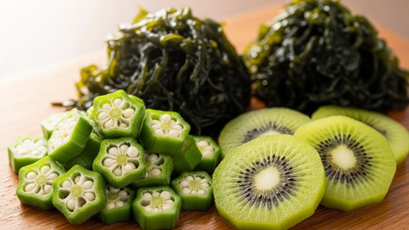水に溶けず、便のカサを増やす。摂りすぎると便が硬くなり、逆に詰まる原因になる。 - 水溶性食物繊維(海藻、オクラ、もち麦、果物):